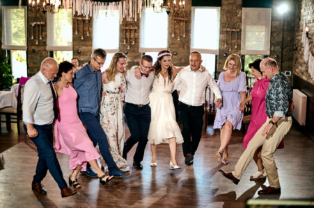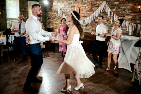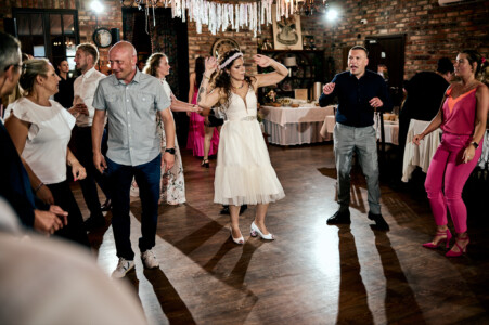 To czas, kiedy emocje eksplodują. Pierwszy taniec, wspólne świętowanie, nieskrępowane reakcje. Uwielbiam momenty, gdy goście zapominają o mojej obecności – wtedy dzieją się najciekawsze rzeczy. Fotografuję z parkietu, zza stołu, czasem z ukrycia. Szukam mikrohistorii – przytulenia babci, dzieci śpiących pod stołem, toastu, który niespodziewanie kończy się salwą śmiechu.
